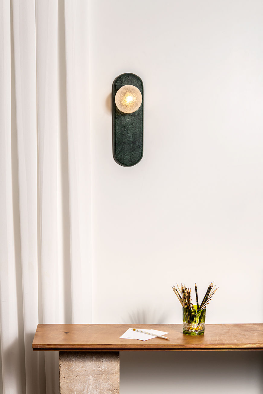 גוף תאורה צמוד קיר עשוי אבן ורדה גוואטמלה בשילוב כדור אריג זכוכית